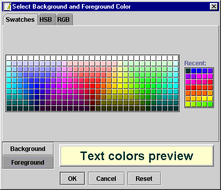 This class represents a powerful, pre-built component used for color selection. JColorChooser is normally used in a modal dialog. It consists of tabbed pane containing three panels each offering a different method of choosing a color: Swatches, HSB, and RGB. A color preview pane is displayed below this tabbed pane and always displays the currently selected color. Figure 14.3 illustrates.