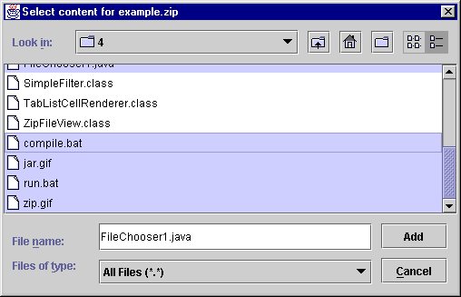 Interestingly, JFileChooser does not check whether the filename entered in its text field is valid with respect to its filters when the approve button pressed. So we are forced to check if our File‘s name has a ".zip" or ".jar" extension manually using our custom isArchiveFile() method. If this method returns false we do nothing and return. Otherwise we set up chooser2 to allow multiple selections to make up the content of the archive, and only allow file selections (by setting the fileSelectionMode property to FILES_ONLY) to avoid overcomplicating our archive processing scheme. Also note that we set the dialog title to specify the name of the archive we are creating.